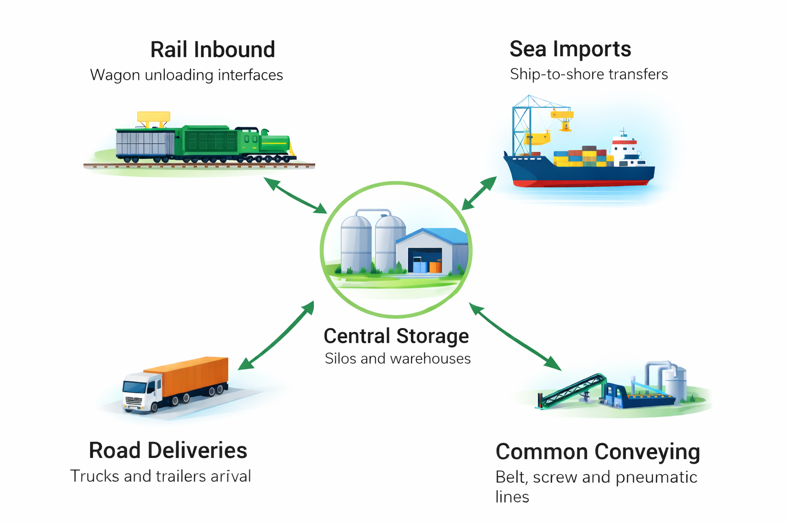 SaveEco designs and executes integrated bulk material handling systems that connect multiple logistics modes to plant storage and processing infrastructure. Engineering scope covers road, rail, sea, and tank container logistics — enabling seamless cross-modal transfer with minimal manual intervention and maximum throughput reliability.