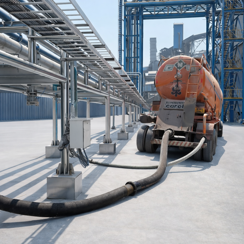 Pressure-assisted road bulker to silo transfer systems, engineered for high-throughput unloading with dust-controlled receiver design.