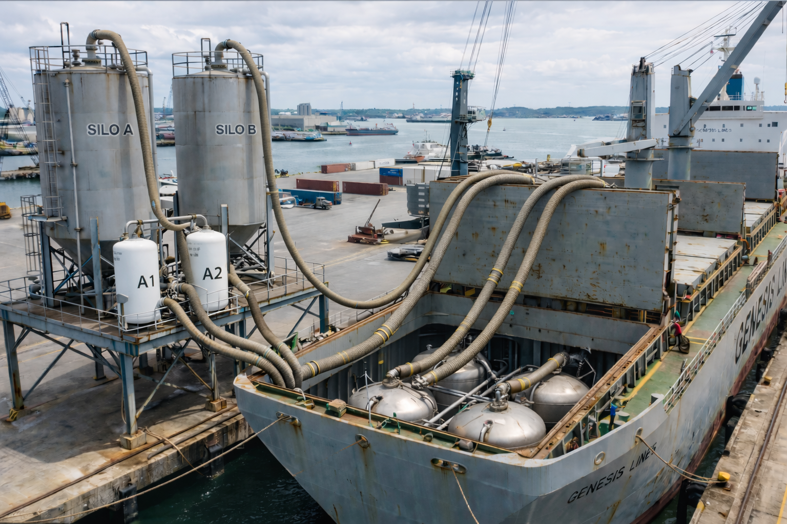 Ship to silo transfer systems for port-side bulk material receipt — engineered for continuous unloading with enclosed conveying to prevent material loss.